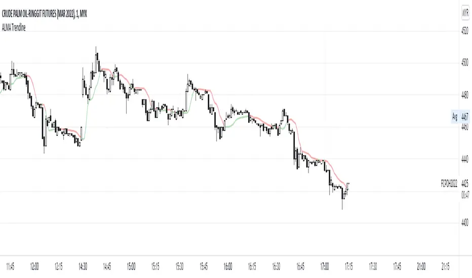 This is a simple indicator to make ALMA Trendline to be used as STOP LOSS guidance in trending market. The trendline will change color from GREEN to RED and vice versa once price crossing down or crossing up the trendline.
