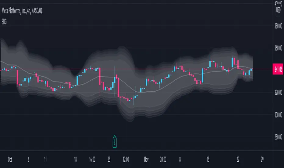 The Bollinger Band Gradient Indicator uses plenty of Bollinger Bands to create a gradient-looking indicator to help with layered entries. It is similar to a Ribbon but better. This indicator is best used with any volume-related indicator so you can recede from entering into any position with too much momentum to rebound off of any line. Note that this indicator is best used with another strategy like pair trading. It is not recommended to trade based on this indicator only. Please stay aware of any news about the stock you are trading because some events may have a big impact and force the market to go bullish/bearish by a lot. This indicator can be used with all chart types and works well with many other indicators. It allows for complete customization and offers easy-to-understand settings which can be designated to a certain individual. You can modify all settings for the BBs which allows for an even more personalized and adapted Indicator that reflects your trading/ investing needs. You also have the option to choose which type of MAs will be used to create the Bollinger Bands, a few of which include: SMA, EMA, WMA, HMA, RMA, DMA, LSMA, VAMA, TMA, MF.
