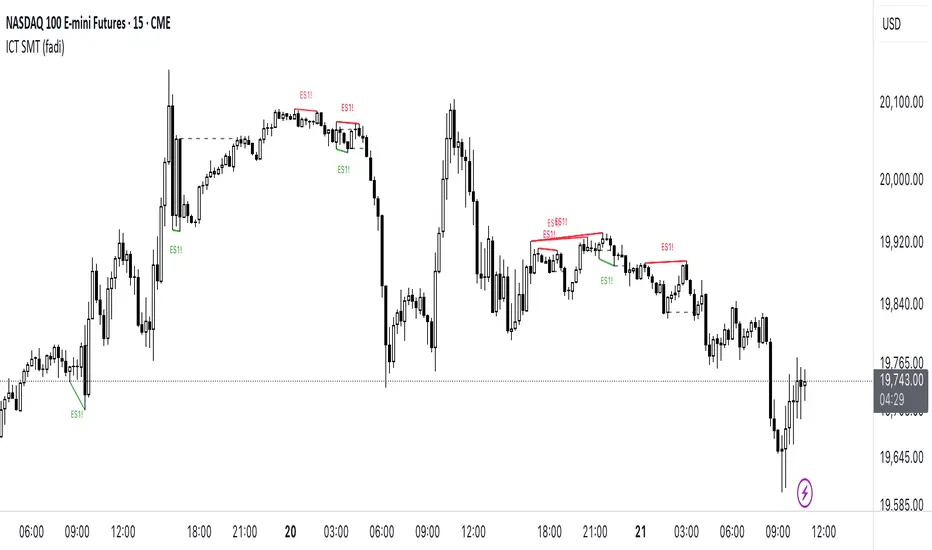 The ICT SMT (fadi) Indicator is a powerful indicator inspired by the Inner Circle Trader (ICT) methodology, designed to identify Smart Money Technique (SMT) divergences between correlated assets. This indicator helps traders spot potential reversal points or trend shifts by comparing price action of a user-defined symbol (e.g., “ES1!” for E-mini S&P 500 futures) against the current chart’s price structure. Ideal for forex, indices, futures, and crypto markets, it highlights discrepancies in correlated asset behavior to enhance trading decisions.