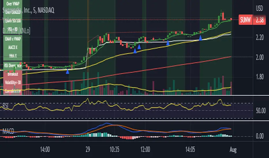 - Volitility: the difference between previous high (9 periods) and previous low (9 periods), average by SMA, if lower than -30, show in green color.