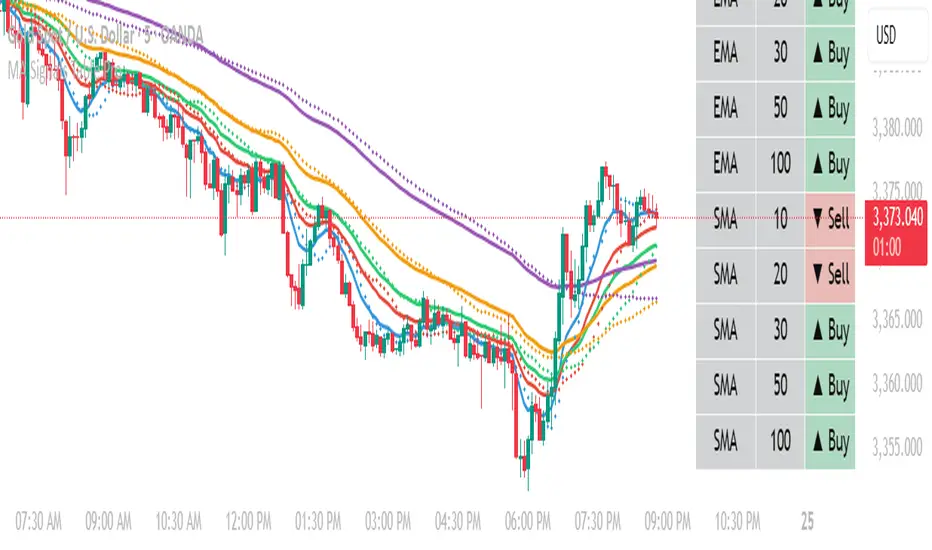 Displays Buy (▲) or Sell (▼) signals based on price position relative to each MA.