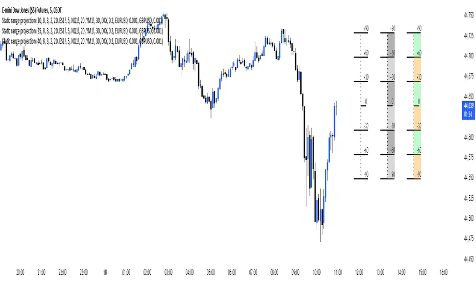 Since all symbols have different price ranges in which they move this indicator doesn't make sense to just have "a one size fits all" approach. That's why you can choose up to 6 symbols and set the range that you want to have shown for each when you pull it up on the chart. Using my default values that means for when the NQ (Nasdaq future) is on the chart you will see a range of 20 handles projected. When you change the the ES (S&P500 future) you will instead see 5 handles. While the number is different that is somewhat of an equal move in both symbols.