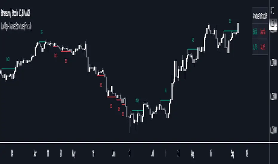 The dashboard reports the structure to fractal percentage, that is the amount of bullish/bearish market structures relative to the total amount of detected bullish/bearish fractal patterns.
