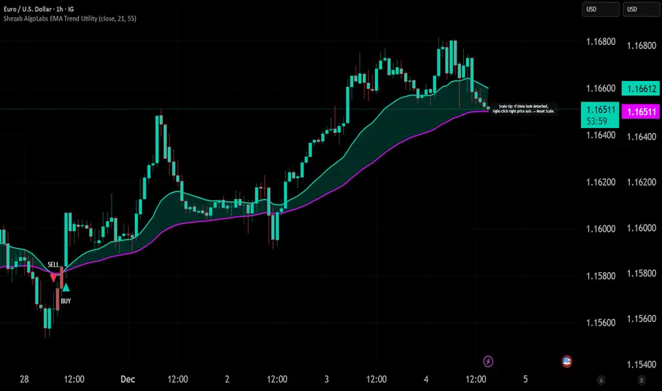 This tool is a clean and practical EMA trend utility built to help traders quickly understand market direction, trend regime, and momentum shifts. It plots a fast EMA and slow EMA using a branded color theme and highlights transitions between bullish and bearish conditions. The script also includes optional visual crossover markers to make regime changes easier to spot.