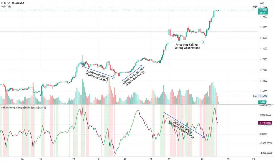 At its core, the Delta MA smooths the raw volume delta to show whether buying or selling pressure is increasing or fading. But the real power comes from its enhanced intelligence:
