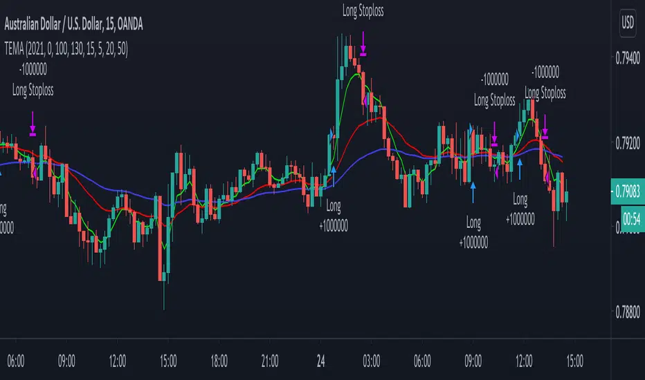 This strategy is an implementation of a standard three exponential moving averages strategy (defaults: EMA1=5, EMA2=20 and EMA3=50 candles). Trades are executed if EMA1 crosses above/below EMA2 and they are both above/below EMA3. In addition, the close of the current candle must be above/below the previous one by at least the number of ticks you specify in the "buffer" parameter (default 150 ticks). This additional check eliminates many bad trades.