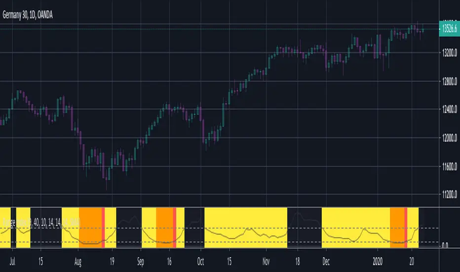 The ATR based filter is calculated by first calculating the running standard deviation of the ATR, and then looking at that in relation to its recent low to find a filtering factor to use on the choppiness index. This makes the choppiness index more reactive to trends, but also slightly more likely to missidentify ranges.