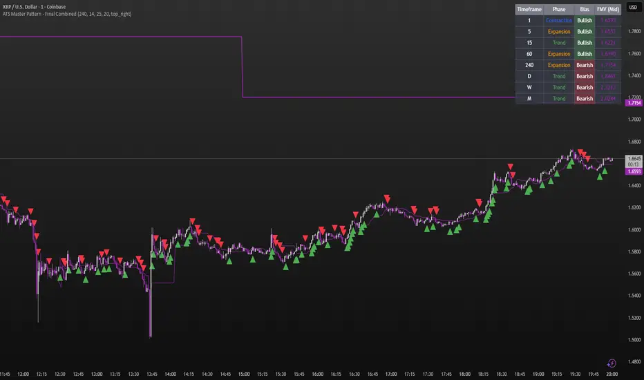 Multi-TF Dashboard: A dynamic, real-time table displaying the Phase, Bias (Bullish/Bearish), and FMV price for eight different timeframes (1m through Monthly).