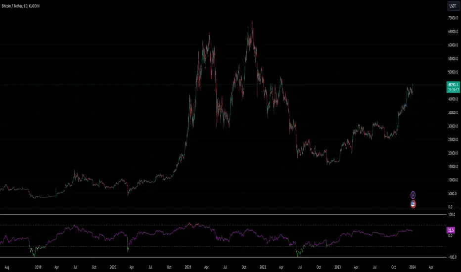 Dynamic Color Coding: The indicator uses dynamic color coding to highlight the current percentage deviation. It turns red for values above 50 (indicating potential overbought conditions), green for values below -50 (indicating potential oversold conditions), and purple for values in between.