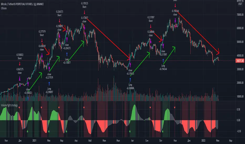 The Volume fight strategy looks for the predominance of bullish or bearish trading volume on the chart by dividing the trading volume in the bar into 2 parts - "bullish volume" and "bearish volume", and comparing the weighted average values by volume with each other at a given distance.
