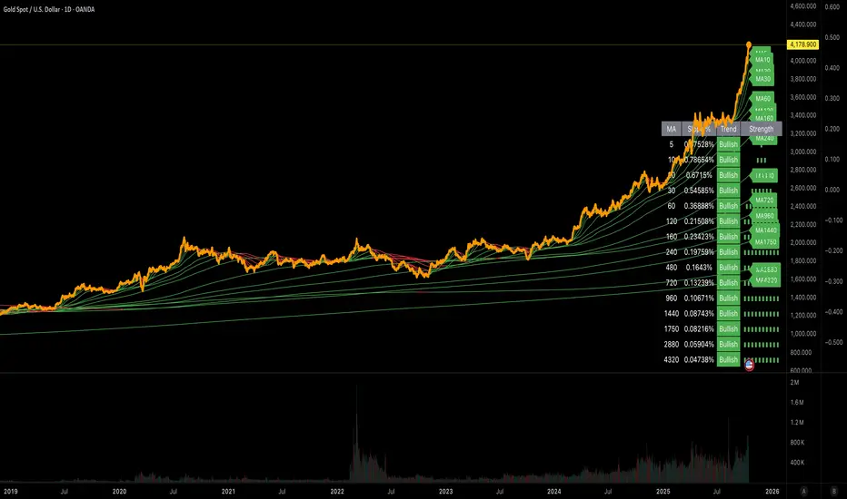 Lightweight indicator that plots up to 15 SMAs (5 → 4320) and shows a compact table with each MA’s: