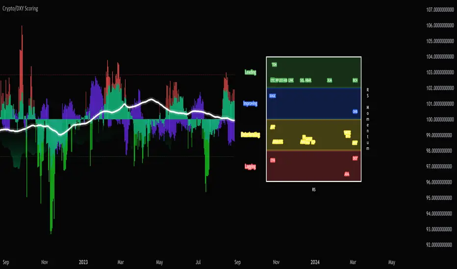 This indicator "Crypto/DXY Scoring", a multi-purpose script, consists of various comparison statistics (including an alternative RS/RSMOM model) to show the strength of a currency against the DXY.