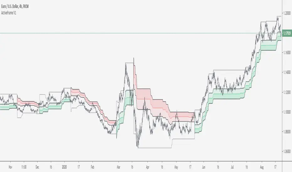 "ActiveFrame" is a mashup of a Supertrend and Donchian Channels, an attempt to find the "Pullback Zone" or "optimal" Entry Zone before trend continuation, partners well with Oscillators for entry signals.