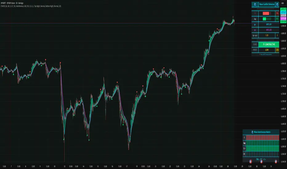 Wave Conflict Detector applies wave interference principles from physics to dual-EMA analysis, identifying potential pivot conditions by measuring phase relationships and amplitude states between two moving average waves. Unlike traditional EMA crossover systems that signal on wave intersection, this indicator measures the directional alignment (phase) and interaction strength (interference amplitude) between wave states to identify conditions where wave mechanics suggest potential reversal zones.