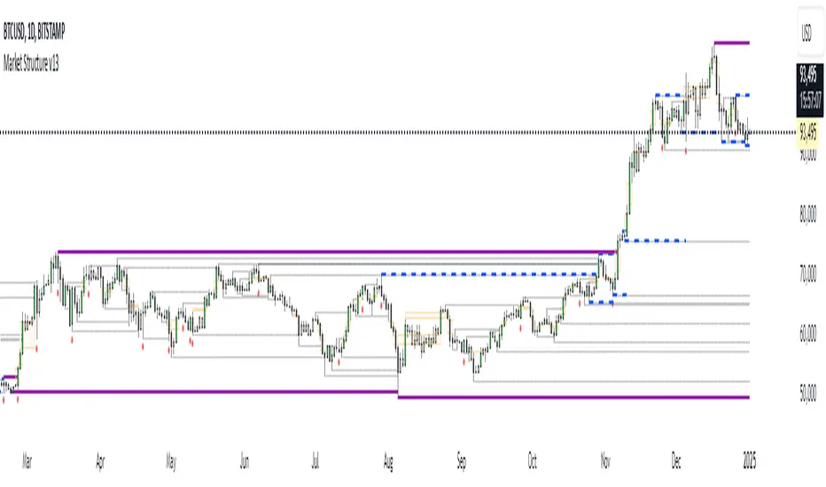However, this indicator has a higher accuracy of identifying the correct price structure by only marking a structure high or low, when a subsequently opposite side liquidity is taken/raided. Further the broader trend of the markets can be easily identified by looking as to which side the Break of Structure has happened. (This is visible in the indicator in the form of 'Range' feature, so if a Range High is broken then it is understood to be in an uptrend & vice versa)