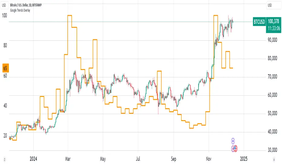 This indicator overlays Bitcoin Google trends data starting from 16/12/2018 until 10/12/2023. To have more recent data, you will need to update the data points manually.
