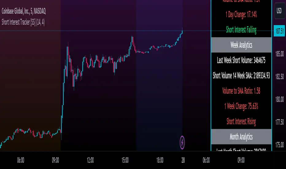 You can customize the SMA length and the assessment of whether short volume is increasing or decreasing. The default SMA length is 14 and the default assessment of rising/falling short volume is 4. This means, short volume has to rise or fall over a 4-period timeframe for it to register. So on the week, if it displays short volume increasing, it means that, over the past 4 weeks, the sma has steadily risen. Inverse if it decreases. If you want it to be more sensitive, you can reduce it to 2 or 3. If you want it to be more strict, you can increase it to 5 or 6.
