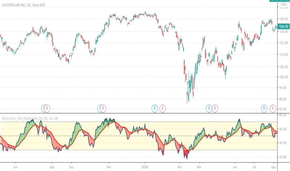 It is an RSI indicator. Unlike the rest, we can see at a glance areas of over-buying and over-selling. We can also see the crossing of the RSI indicator with the Exponential Moving Average with its colored areas.
