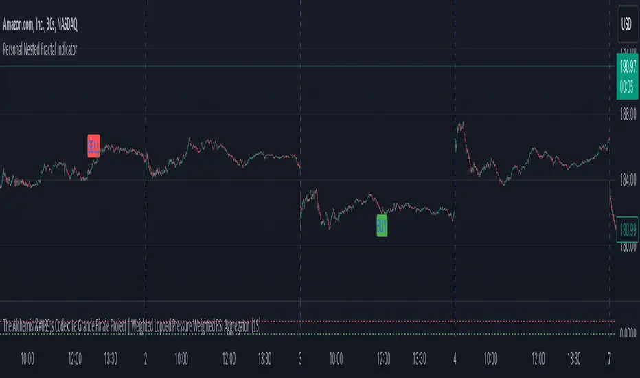 This script implements a nested fractal-based indicator that identifies potential buy and sell signals by analyzing fractal patterns in price action. It calculates larger and smaller fractal highs and lows and uses these patterns to confirm entry points. When smaller fractals appear within the range of larger fractals, the script generates buy or sell signals, which are plotted on the chart as visual markers. The logic is based on detecting price turning points through fractal analysis without any further complexity or additional filters.