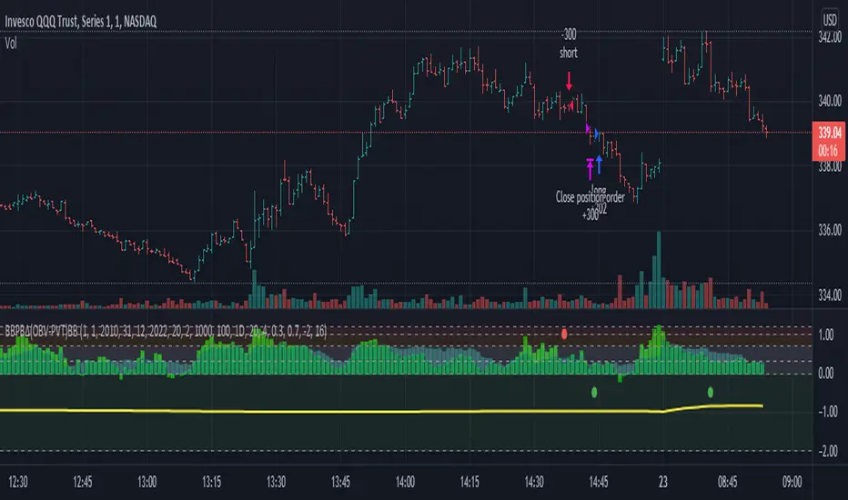 #3 BB%B of the Δ(OBV-PVT). This is the green histogram. We took the OBV and subtracted the PVT from it, then we found the delta of that compared to the previous candle. This output a line, which we wrapped in bollinger bands to find the BB%B of this line. This line is represented as a histogram, for visual clarity.