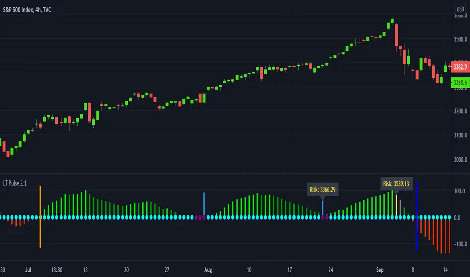 After a pulse “fires” and then the momentum on the pulse dissipates, meaning when bright green histogram bars turn to dark green and then grey - or when bright red histogram bars turn to dark red and then grey - this indicates that there is a higher risk that price could reverse from its original direction, since the momentum is weakening. So for example, if after a pulse signal fires to the upside (positive) and then the green histogram bars turn dark green and then grey – this shows that there is a high probability that the upward momentum has ended and thus downside risk has increased (the reverse applies for red histogram bars when the pulse fires to the downside).