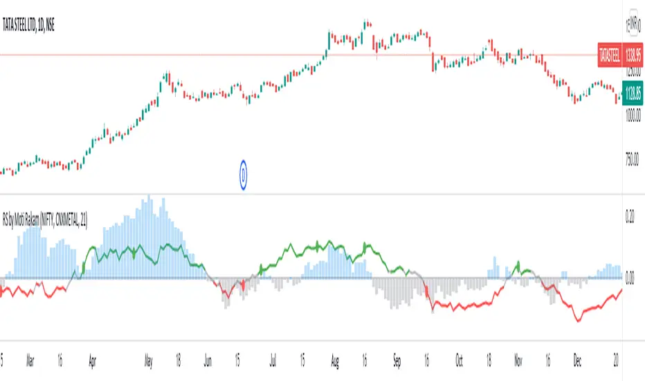 1. Relative Strength of the sector index, against the wider market index. For example, in Indian market relative strength of any sector index like CNXAUTO or CNXMETAL, against NIFTY. RS of sector index against wider market index is plotted in "Columns". Blue color of Columns above zero line signifies that "Sector Index is outperforming the Wider Market Index". Gray color Columns under zero line signifies that "Sector Index is underperforming the Wider Market Index".