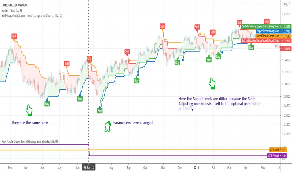 The algorithm was borrowed from Profitable SuperTrend and connected to the basic SuperTrend implementation. So, now it will switch parameters automatically without any manual work required.