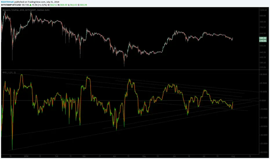 This script shows the relative price difference based off the last high and low, so many bars ago. Bollinger bands are also included by default for closer inspection on the intensity of the movement or the lack thereof. Bollinger bands will follow the smoothed line which will allow the reactionary line to cross the boundary during an intense movement. With the colors selected, a gray color will appear after the color to the zero line to announce a deep correction is possible. Buy/Sell indicators show up as crosses to indicate when the price is moving in a certain direction. Sideways stagnation will have several crosses due to the close proximity to the zero line.