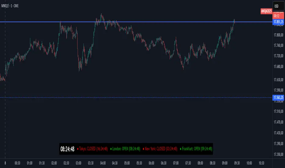 This indicator provides a digital clock and real-time status for major financial markets, including Tokyo, London, New York, and Frankfurt. It displays whether each market is currently OPEN or CLOSED, along with the time remaining until the market opens or closes. The indicator is designed to keep traders informed about market activity at a glance.
