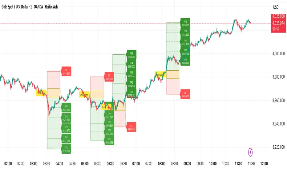 * The indicator performs best with default settings on the XAUUSD (OANDA) chart, 1-minute timeframe, and Heiken Ashi candles.