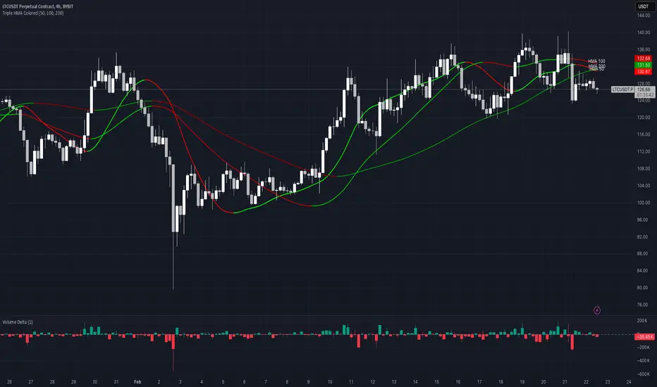 Triple HMA Colored Indicator DescriptionThe Triple HMA Colored indicator is a sophisticated technical analysis tool designed to enhance trend identification by displaying three Hull Moving Averages (HMAs) on your chart, each with fully customizable periods and dynamic color settings. This indicator is built on the refined HMA calculation method, which leverages weighted moving averages (WMAs) to generate smooth and responsive trend lines with minimal lag.