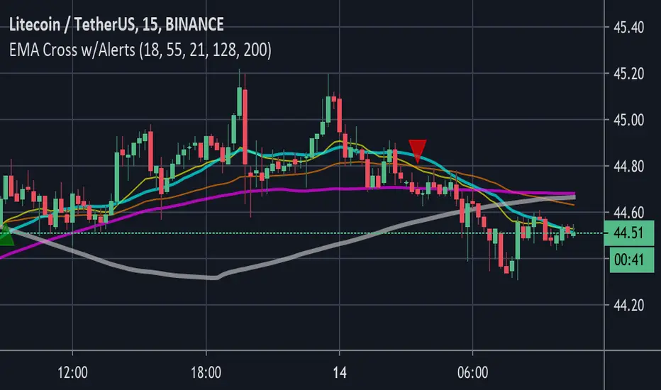 A Long or Short signal is fired when EMA1 crosses EMA2 - a cross up is a Long signal, a cross down is a Short signal.