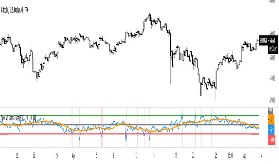 This indicator shows you the difference between the price on the spot exchanges and the derivatives exchanges. When the ratio spikes upward, it is a good buying opportunity, and when it spikes downward, it is a good moment to sell. The best timeframe for this indicator is 4h. The calculation includes top 10 spot and derivatives exchanges by volume .