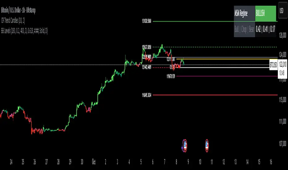 Rather than simply reacting to price movement, the MSM estimates the next most probable regime and projects a directional return. This probabilistic forecast gives BB Levels a forward-looking edge most indicators lack.