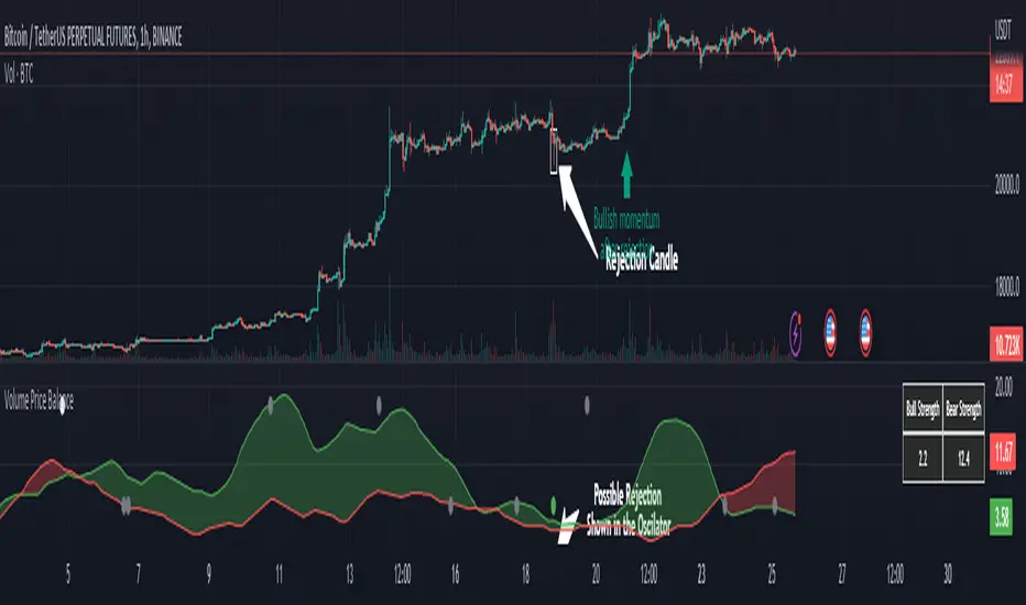 This oscillator tries to analyze volume spread along with price spread based on wyckoff methods and attains certain "strength value" for each candle and it's relationship with the volume. After this calculation preferably we remove detected rejection candles from overall calculation and draw them as plots. The multipliers of the strengths can be changed from the settings.