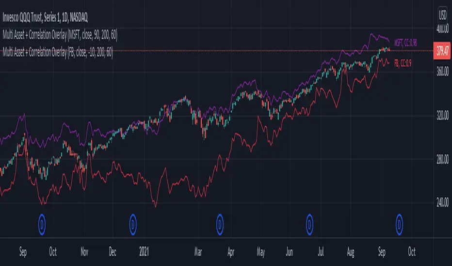 What is does: This script allows you to overlay the price of any ticker onto your chart. It also labels the line with the ticker name, and calculates / labels the correlation coefficient of your newly overlayed asset.