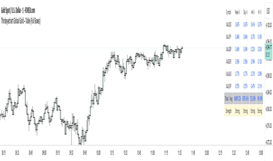 The XAU Solid Trend Table – Last Version is the ultimate TradingView indicator for gold traders who want a clean, professional, and comprehensive view of market direction. This version builds on previous releases by combining percentage changes, multiple timeframes, and a Total Average Calculation into a solid, boxed table that clearly displays strong and weak trends in XAU and its related pairs.