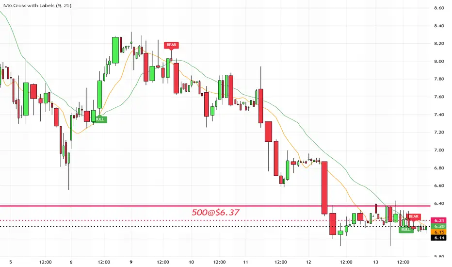 This indicator is a clean, visual-first trend tracker designed to identify momentum shifts using a standard Moving Average crossover. Unlike traditional crossover indicators that clutter the chart with lines or simple icons, this script uses high-visibility labels to call out "BULL" and "BEAR" signals directly at the source of the price action.