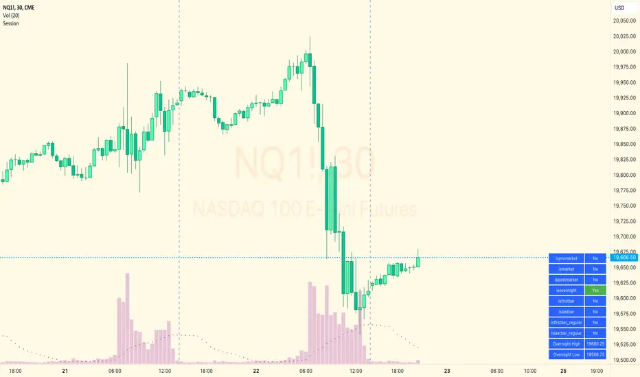 Returns true if the current bar is a part of the pre-market, false otherwise. On non-intraday charts always returns false. Works for futures (TradingView's methods do not).
