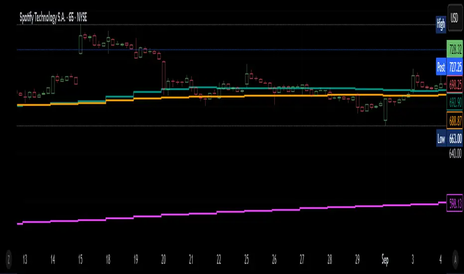 • Live: current HTF bar → updates intraday. - Extras: optional value labels, compact live values table, background cues, and %-distance label.