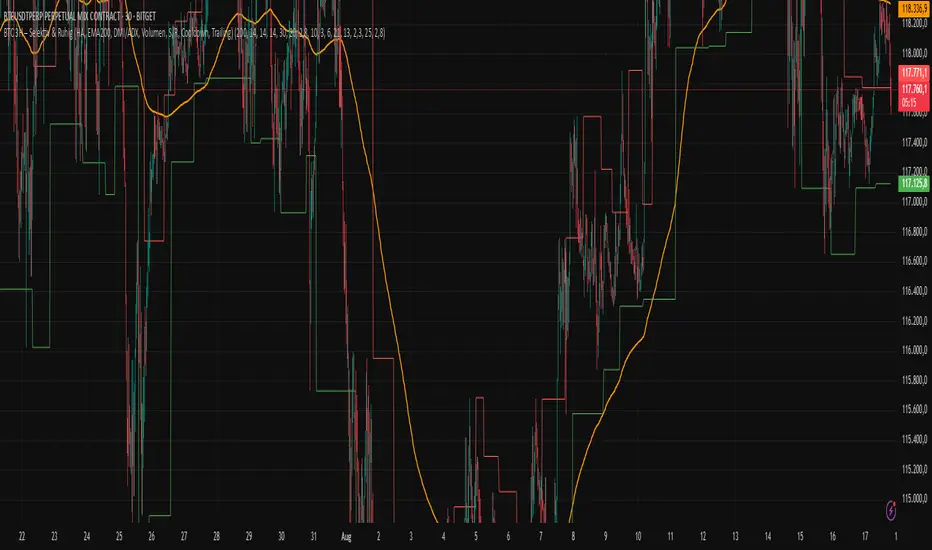 The strategy uses EMA200, ADX/DMI, RSI, and volume. Pivot levels and Heikin-Ashi ensure safe entries, while cooldowns and opposite-locks prevent overtrading. Exits are managed with ATR trailing stops and trend-reversal signals.