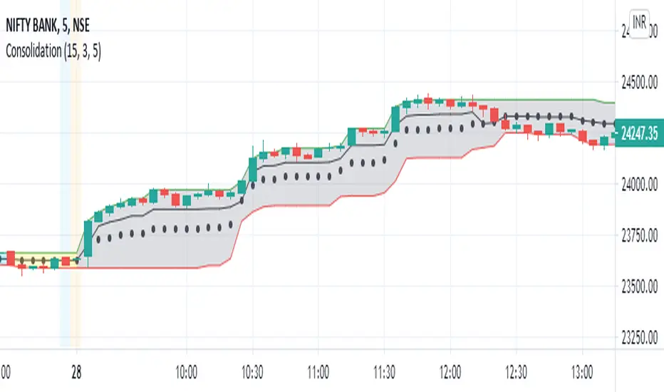 Experimental : This script identifies the consolidation of a stock for selected time period. The consolidation period and range can be configured. 2 levels of consolidation levels can be selected. i.e Strong and medium. The range for strong and medium level of consolidation can also be configured by the user.