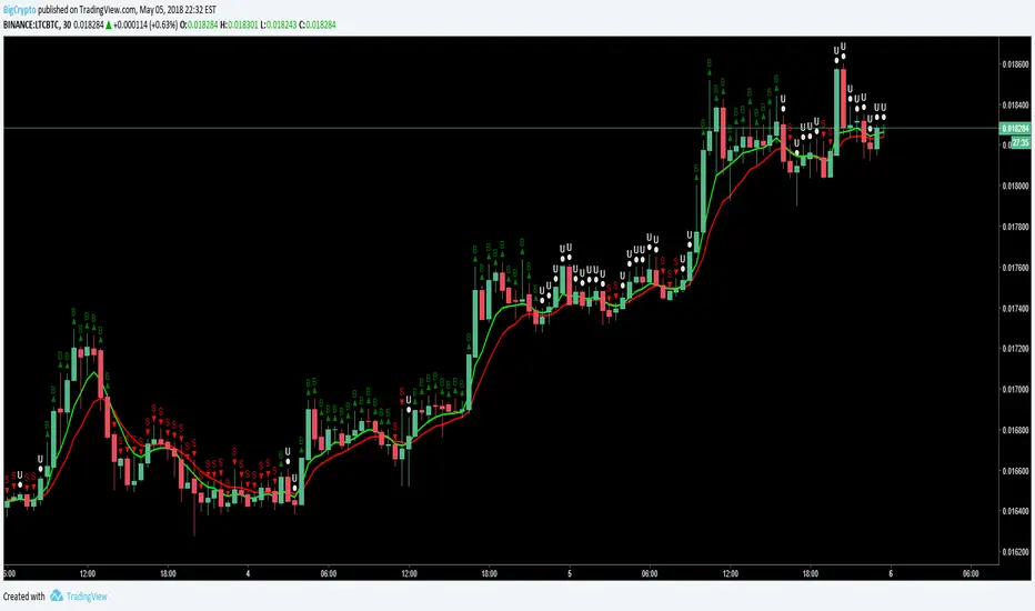 This is a simple script based on MACD and exponential moving average working together. If there is a disagreement between them, an "unknown" state is shown and denoted by a "U".