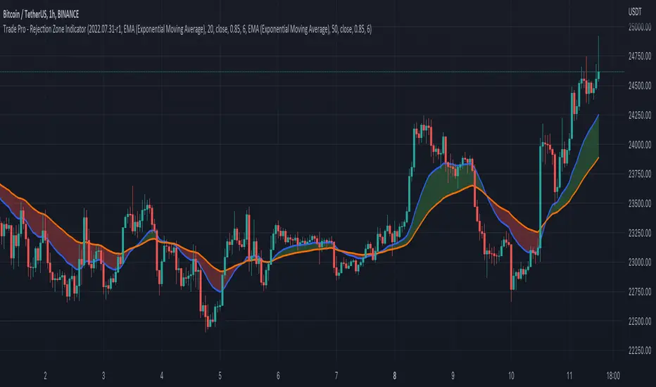 The suggested use of the Rejection Zone Indicator is to look for long trades when the cloud is green, and once price has pulled back into the green cloud. If the cloud is red one can look for short trading opportunity when price pulls back into the red cloud.