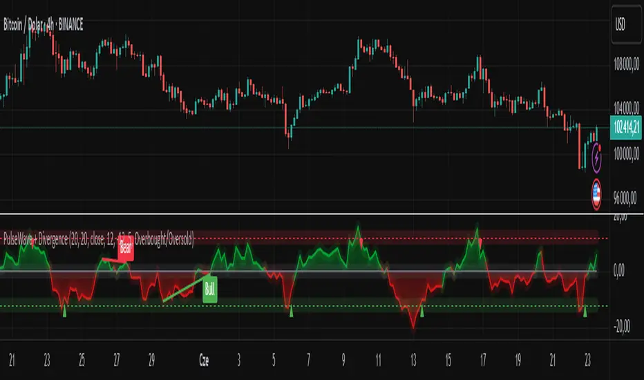 PulseWave + Divergence is a momentum oscillator designed to optimize the classic RSI. Unlike traditional RSI, which can produce delayed or noisy signals, PulseWave offers a smoother and faster oscillator line that better responds to changes in market dynamics. By using a formula based on the difference between RSI and its moving average, the indicator generates fewer false signals, making it a suitable tool for day traders and swing traders in stock, forex, and cryptocurrency markets.
