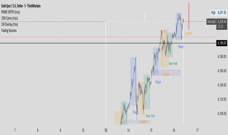 Overlay of the Weekly candle, simple one color with a line inside the candle to show direction.