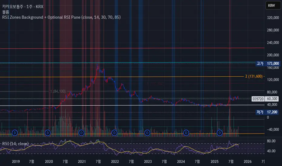 가격 차트 뒤쪽에 RSI ≤30이면 파란색, RSI ≥70이면 빨간색 배경이 나타납니다(색상은 설정에서 변경 가능).