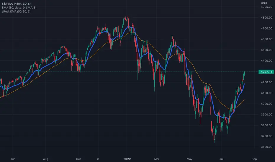 TASC's September 2022 edition of Traders' Tips includes an article by Vitali Apirine titled "The Linear Regression-Adjusted Exponential Moving Average". This script implements the titular indicator presented in this article.