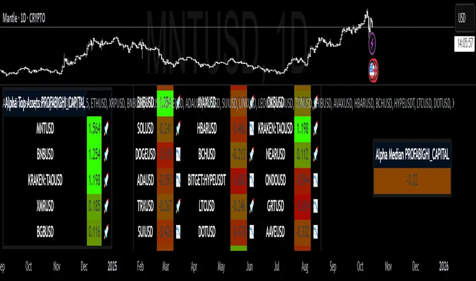 – Top Assets Table: Ranks the highest alphas descending in a 3-column format (symbol, value, emoji), with header branding for focused opportunity highlighting.