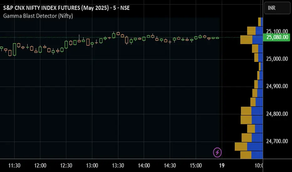 The Gamma Blast Detector (Nifty) is a custom TradingView indicator designed to help intraday traders identify sudden and explosive price movements—commonly referred to as "gamma blasts"—in the Nifty index during the final minutes of the trading session, particularly on expiry days. These movements are typically caused by rapid delta changes in ATM options, resulting in aggressive short-covering or option unwinding.